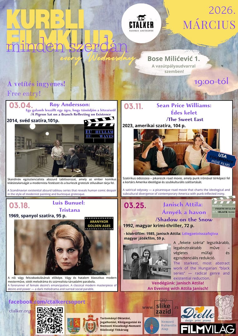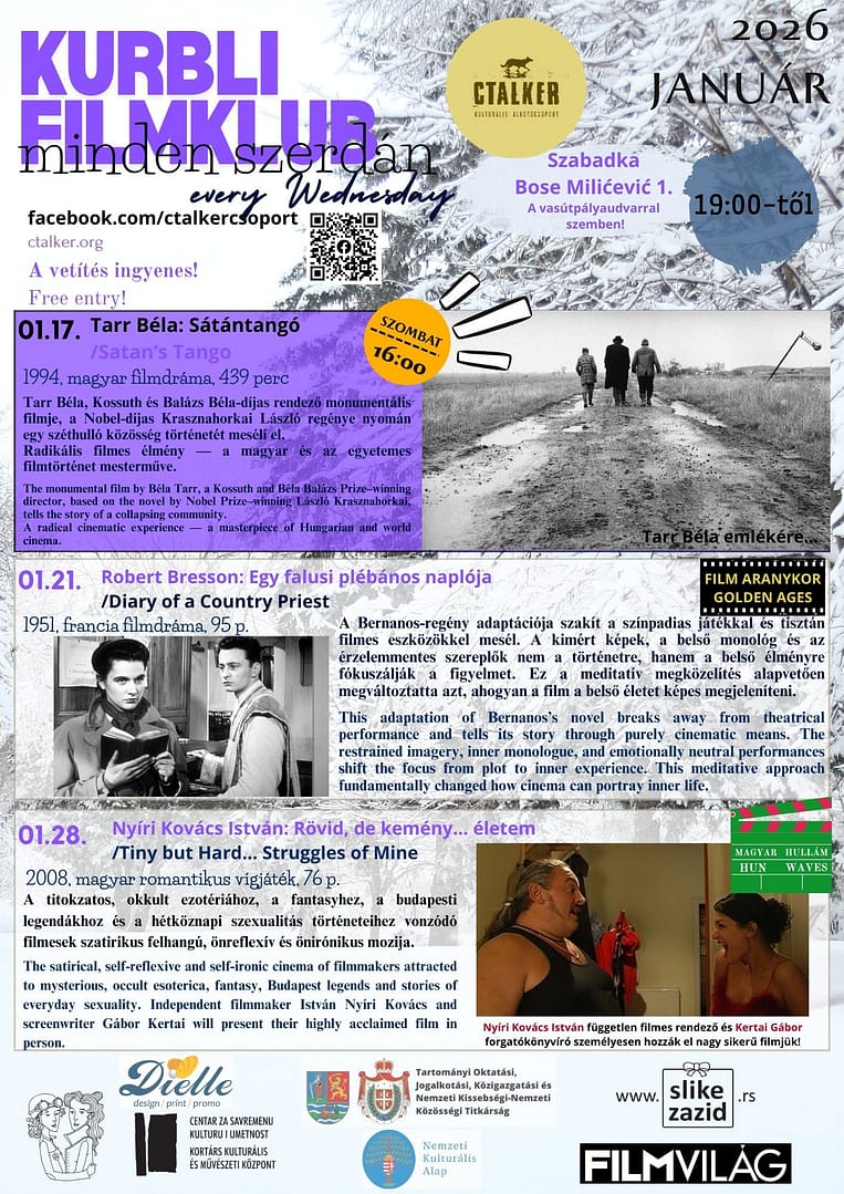 2026.01.17./Szabadka 2026 január 6-án Tarr Béla elhunyt, a nemzetközi filmes avantgarde egyik legnagyobb alakja, aki 2026. január 6-án hunyt el 70 éves korában — a magyar és világfilm egyik megkerülhetetlen mestere. Rendhagyó vetítéssel tisztelegtünk...