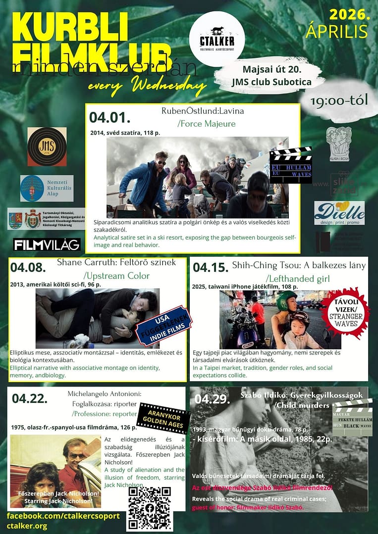M Á R C I U S-i Kurbli Filmklub Tavaszi lendülettel szállítjuk a filmművészet remekműveit Folytatjuk az USA indie filmek vetítését, de maradunk a klasszikusoknál is! Janisch Attila, újra Szabadkára látogat hozzánk, ne hagyjátok ki...